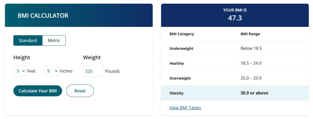 I know that my current weight is 320 pounds and that I am 5′ 9″.